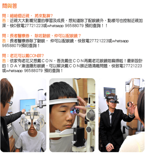 本公司具備先進儀器,著重於優質護眼服務,為閣下提供『綜合眼科視光檢查』、兒童視覺檢查及訓練、色覺檢查、視野檢查、青光眼檢查、白內障檢查、視網膜檢查、角膜矯形、隱形眼鏡驗配及跟進護理、眼鏡及太陽眼鏡驗配等專業服務。